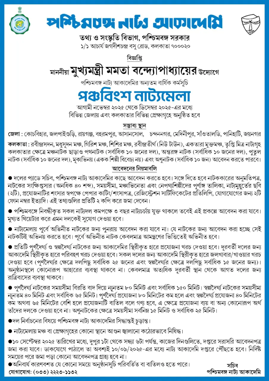 On 26 September 1987, Pashimbanga Natya Akademi was established under the Department of Information and Cultural Affairs, Government of West Bengal with a view to create a supporting ambience to the practice and development of Histrionic Art. Its main objectives are, to encourage the practice and development of Theatrical Art throughout West Bengal, encourage production of Bengali drama and give financial support to the theatre Groups of the state as much as possible.